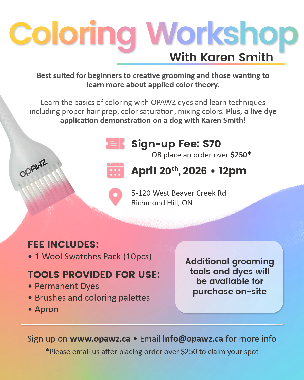 Best suited for beginners to creative grooming. Learn the basics of coloring with OPAWZ dyes and learn techniques including proper hair prep, color saturation, mixing colors, and blending & creating ombre effects on wool swatches.ย